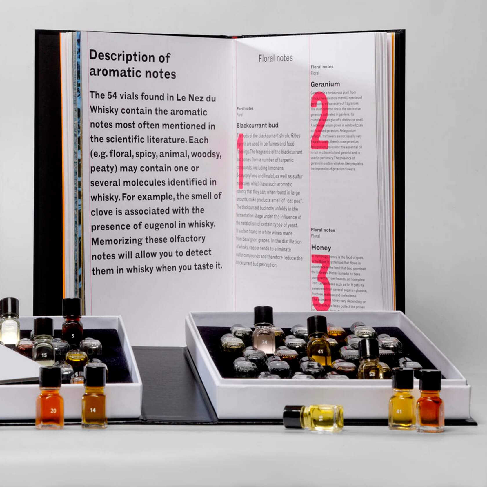 Набор произведён во Франции и включает 54 флакона с натуральными ароматами, а также обучающие карточки и иллюстрированный буклет на английском языке. Всё размещено в элегантном футляре с отделениями, выполненном в черно-белой цветовой гамме. Вес комплекта составляет 2 кг — оптимально для настольного использования и транспортировки. Ароматы изготовлены на основе эфирных масел, что гарантирует реалистичность, стойкость и безопасность при использовании. Упаковка из прочного картона, стекла и пластика рассчитана на длительное применение и бережное хранение.