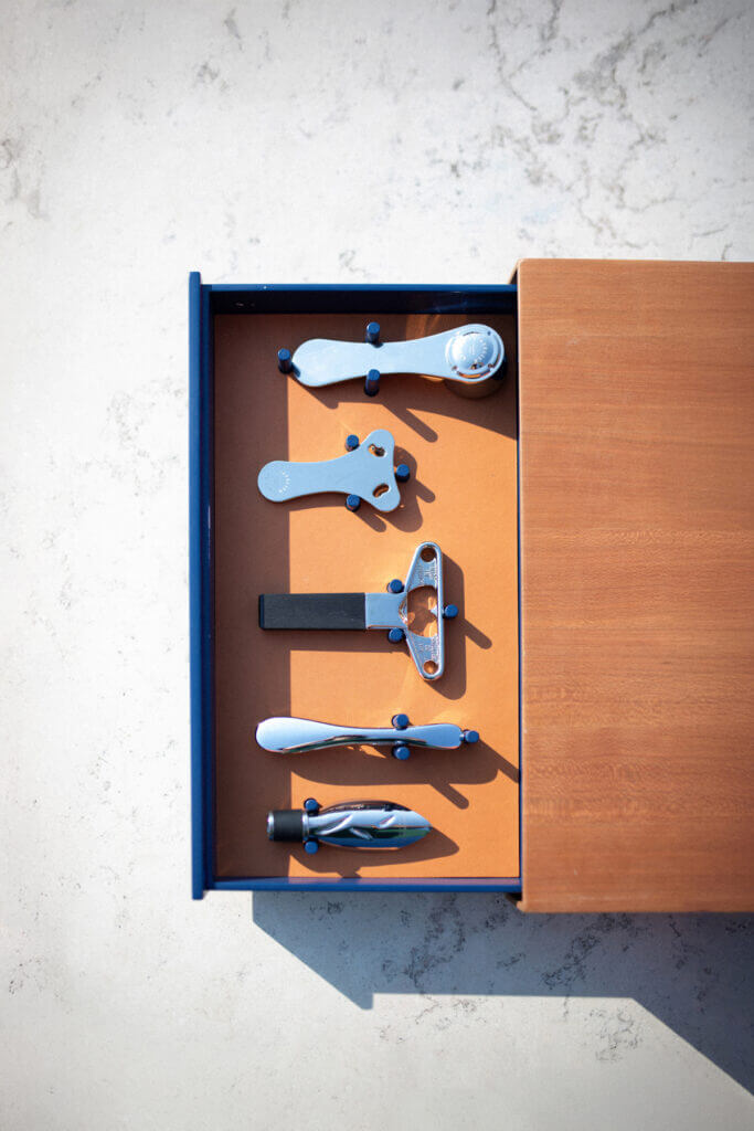 Изготовлен из тщательно отобранной вишнёвой древесины с мастеровой отделкой. Поднос выполнен в минималистичном дизайне с эффектом «парения» — слегка приподнятым основанием, создающим ощущение лёгкости. Под поверхностью расположены два элегантных выдвижных ящика: жёлтый — с десятью вручную изготовленными кожаными подставками‑подстаканниками, и синий — с пятью винными инструментами на толстой кожаной подложке и аккуратных деревянных вставках. В комплект входят: штопор Bilame Chromé, сомелье Garçon®, фольгооткрывалка из хромированного металла, The Cork Opener и Pourer Leaf. Скрытые ящики открываются лёгким нажатием (push‑pull), обеспечивая плавность и изящество использования.
