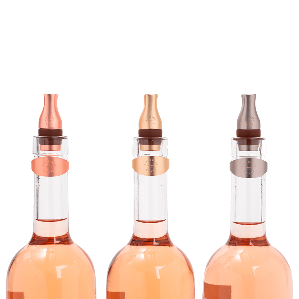 Произведённый во Франции, набор включает семь предметов: три пробки, три каплеуловителя и кожаный мешочек для хранения. Вес комплекта составляет 0,7 кг, что делает его лёгким в транспортировке и использовании. Все элементы выполнены из премиальных материалов: металл, силикон и натуральная телячья кожа. Цветовая палитра (розовый, серебристый, золотой) подчёркивает изысканность аксессуара и делает его эффектной деталью сервировки. Комплект надёжно защищает вино от окисления и капель, сохраняя чистоту и эстетику процесса подачи.