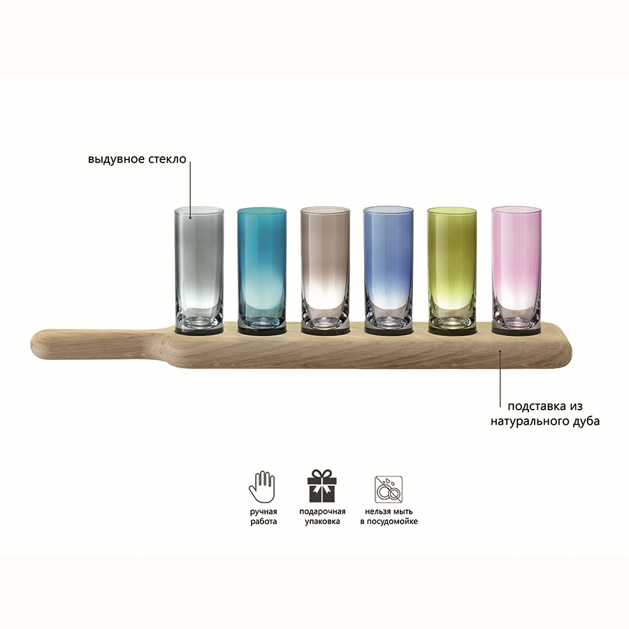 Набор из 6 стопок и деревянной подставки Lsa International Paddle 40 см разноцветное стекло — стильное решение для подачи крепких напитков, которое украсит любой интерьер и придаст сервировке особый шарм. Изготовлен в Великобритании с применением выдувного стекла и натурального дуба, набор сочетает в себе современный дизайн и традиционное качество. Вес 1,06 кг делает его удобным для переноски и использования, а объем каждой стопки составляет 70 мл — идеальный выбор для дегустации крепкого алкоголя. Благодаря разноцветным стопкам, подача напитков станет яркой и запоминающейся.