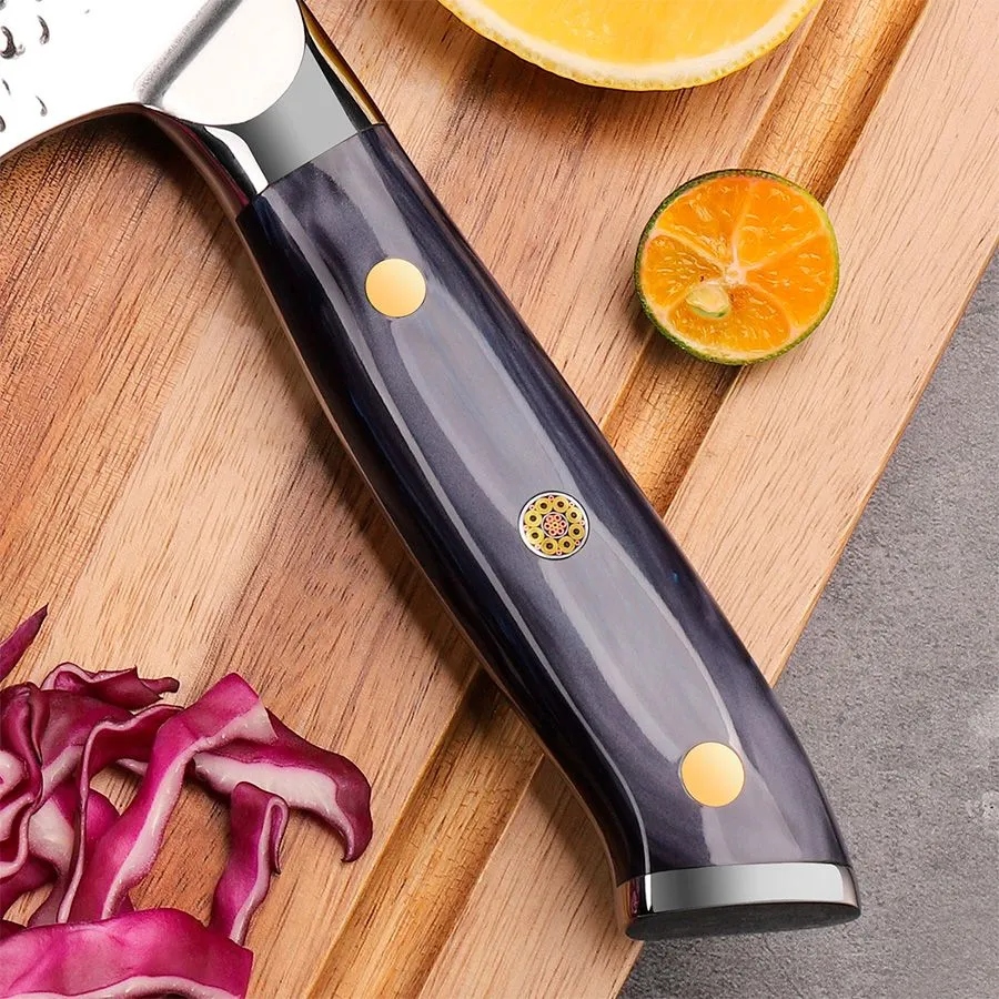 Keemake CJ-1 — премиальный кухонный топорик из коллекции Blue Gem, сочетающий в себе изысканную эстетику и профессиональные характеристики. Этот нож создан для силовой работы — разделки мяса, птицы и рыбы, а также для точной и быстрой шинковки овощей, зелени и фруктов. Благодаря тщательно выверенному балансу и эргономике, топорик Keemake CJ-1 обеспечивает точный контроль при каждом движении и минимальное усилие при резе.