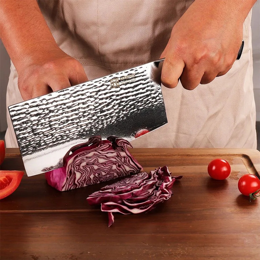 Клинок изготовлен по традиционной дамасской технологии и состоит из 67 слоев стали, окружающих сердечник из японской высокоуглеродистой стали VG10 (10Cr15CoMoV). Такая структура гарантирует превосходную прочность, упругость и устойчивость к износу. После вакуумной термообработки с закалкой и отпуском клинок достигает твердости HRC 60±2, обеспечивая длительное сохранение остроты и легкость заточки. Эффектный волнообразный рисунок на клинке — результат многослойной ковки, придающий каждому ножу индивидуальность и подчеркивающий премиальный статус изделия.