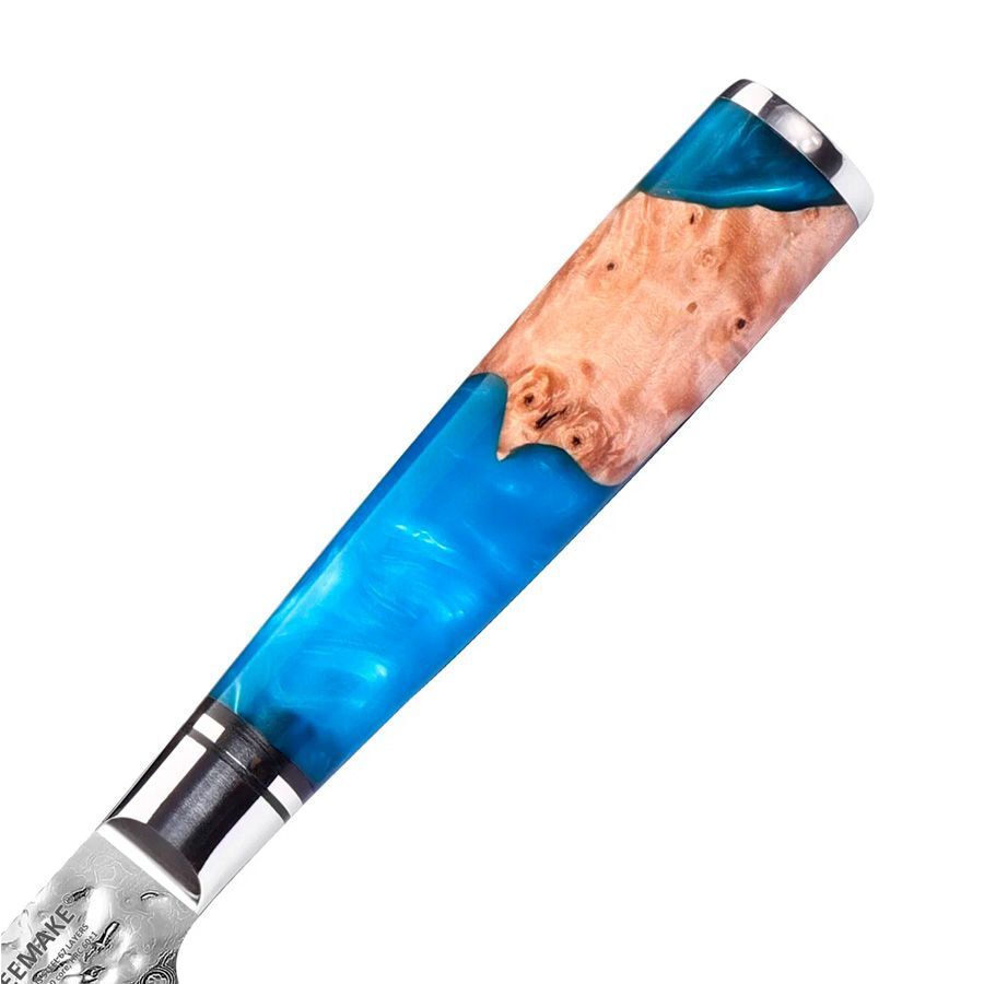 Рукоять ножа выполнена из комбинации гранатового дерева, эпоксидной смолы и стеклотекстолита G-10, что обеспечивает прочность, влагостойкость и долговечность. Эстетика синего и бежевого оттенков гармонично сочетается с клинком, создавая образ, символизирующий небо и землю — источник вдохновения для коллекции Blue Sky. Рукоять овального сечения удобно лежит в руке, исключает проскальзывание и гарантирует максимальный контроль при работе. Стальной больстер плавно соединяет клинок и рукоять, защищая от загрязнений и улучшая баланс ножа. Полный хвостовик (Full Tang) повышает прочность конструкции и долговечность изделия.