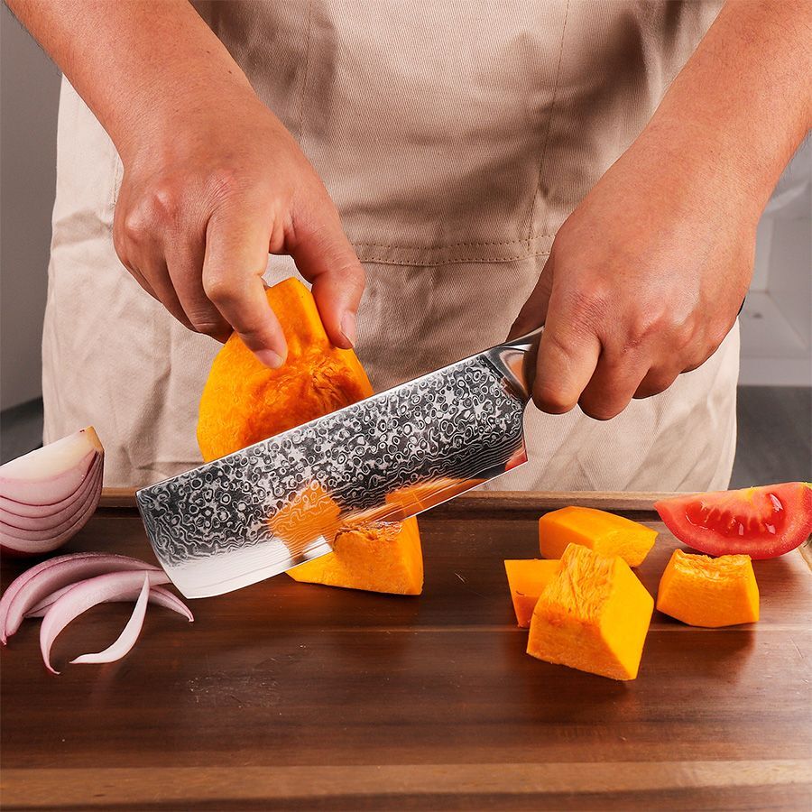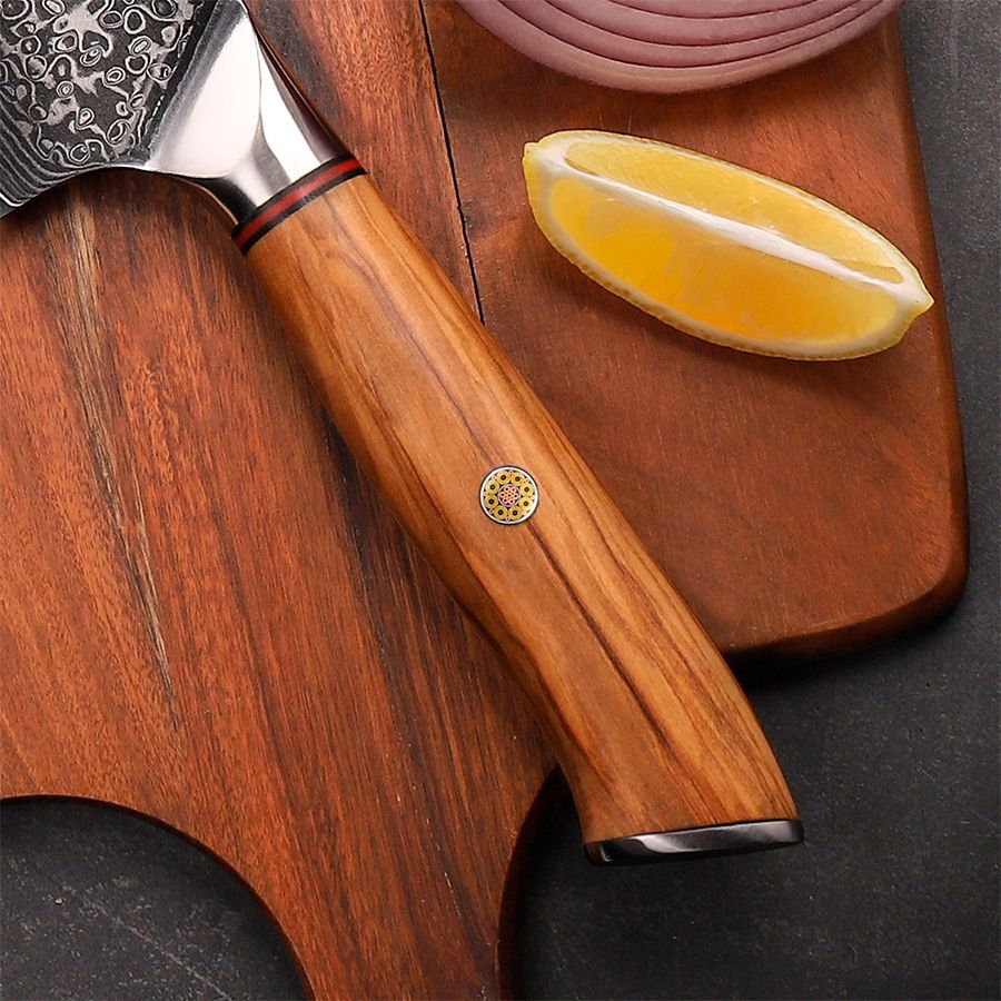 Клинок выполнен по технологии 67-слойной дамасской стали с сердечником из японской высокоуглеродистой стали VG-10 (10Cr15CoMoV), что обеспечивает твердость HRC 60±2. Лезвие проходит вакуумную термообработку и финальную заточку на водных камнях (#6000 грит), благодаря чему достигается сверхострая режущая кромка и стойкость к износу. Симметричная двусторонняя заточка под углом 12–15° позволяет выполнять рез любой сложности — от тонкой шинковки зелени до разделки плотных овощей. Уникальный волнистый рисунок дамасской стали подчеркивает премиальный статус ножа и делает каждый экземпляр неповторимым.