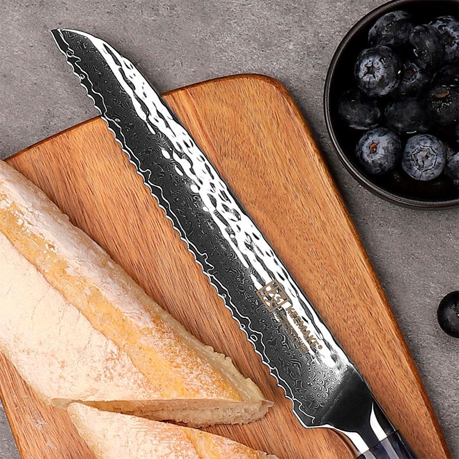 Премиальный нож для хлеба Keemake CJ-5 из серии Blue Gem создан для тех, кто ценит идеальное качество реза, долговечность и изысканный дизайн. Этот нож изготовлен по традиционной технологии дамасской ковки с сердечником из стали VG10, что обеспечивает выдающуюся твердость (HRC 60±2), остроту и устойчивость к износу. Благодаря серрейторной заточке с волнообразной режущей кромкой, нож позволяет аккуратно и легко нарезать хлеб, багеты и другую выпечку, не сминая и не кроша продукт. Он идеально подходит как для профессиональных поваров, так и для домашних кулинаров.