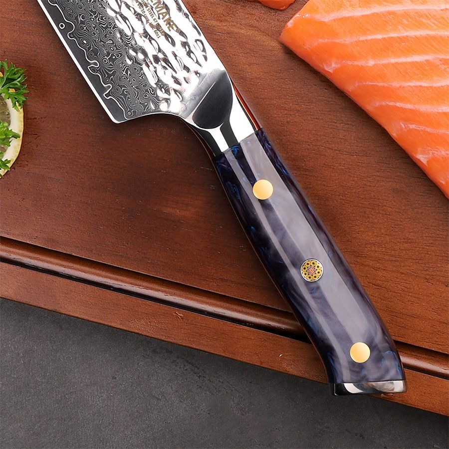 Клинок выполнен по классической дамасской технологии из 67 слоев стали марки 316 с сердечником из высокоуглеродистой стали VG10 (10Cr15CoMoV). Благодаря твердости 60±2 HRC, лезвие долго сохраняет остроту, обеспечивая чистый и плавный рез. Уникальный волнообразный узор на поверхности клинка подчеркивает премиальный характер ножа. Вакуумная термообработка с отпуском придает клинку повышенную упругость, коррозионную стойкость и износоустойчивость. Рукоять выполнена из прочной эпоксидной смолы глубокого синего цвета с мозаичным пином из меди, что придает ножу элегантность и индивидуальность. Цельнометаллический хвостовик (Full Tang) и плавный переход от больстера к клинку обеспечивают отличную развесовку и надежный контроль при работе.