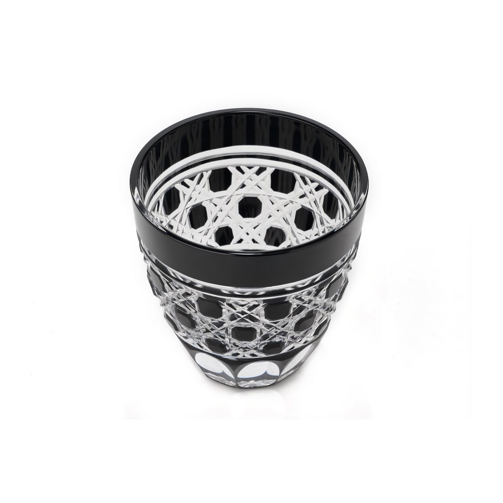 Изделие изготовлено в технике Эдо Кирико — узор вырезается алмазными инструментами на тончайшем слое цветного стекла, после чего каждая грань вручную полируется до благородного блеска. Черный цвет считается одним из самых сложных в производстве: слой цветного стекла чрезвычайно тонкий, и добиться насыщенного оттенка долгое время было невозможно. Специалисты Tajima Glass первыми разработали технологию ультратонкого черного стекла, на 0,3 мм тоньше, чем в других мастерских. Из-за того, что гравировка на черном стекле практически не видна, мастера работают на ощупь, полагаясь на опыт и интуицию, поэтому изготовление одной рюмки требует втрое больше времени и усилий.
