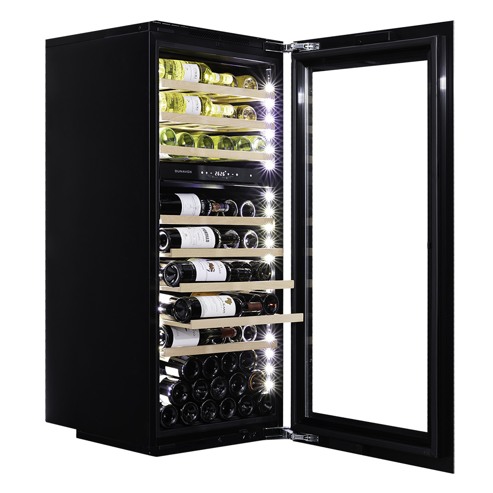 Компрессорный винный шкаф Dunavox DAVS-72.185DSS обладает большой вместимостью и способен разместить в себе до 72 бутылок. Располагаются они на выдвижных полках из массива бука. Внутреннее пространство шкафа разделено на 2 температурные зоны с возможностью настраивать каждую из них в диапазоне от +5 °C до +20 °C. Электронный термостат помогает стабильно поддерживать заданную Вами температуру. Холодильник поддерживает влажность в диапазоне 60-80%, как в настоящем винном погребе. Для дополнительного повышения влажности предусмотрен контейнер для дистиллированной воды.